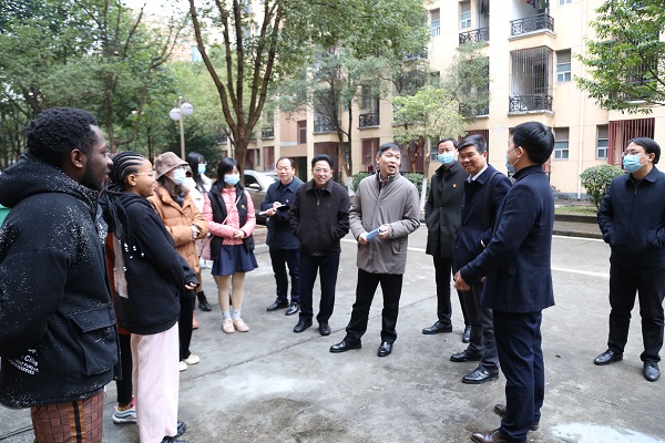 在我校留学生公寓,李瑞峰一行详细了解了留学生管理等工作,并与来自卢旺达的约瑟夫等留学生亲切交流,询问留学生们在学校的学习和感受。