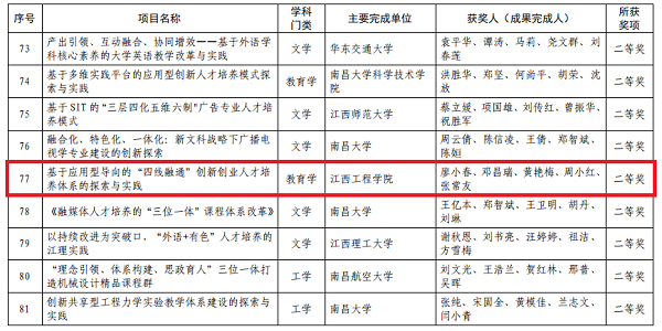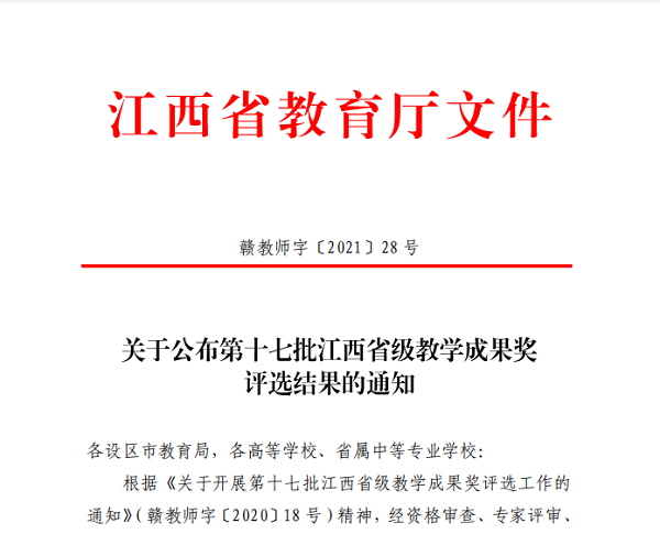 日前,江西省教育厅印发《关于公布第十七批江西省级教学成果奖评选结果的通知》(赣教师字〔2021〕28号),我校廖小春等人申报的《基于应用型导向的“四线融通”创新创业人才培养体系的探索与实践》项目获得省级教学成果奖高等教育(本科层次)二等奖。