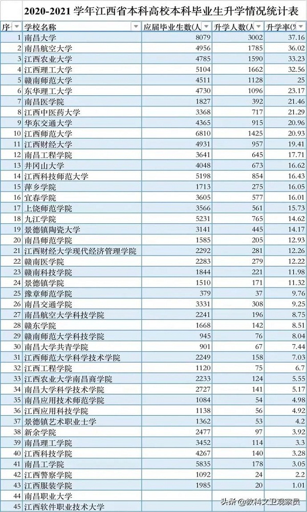 3月2日,江西省教育厅发布了2020-2021学年本科教学质量分析报告,其中有江西各大本科高校的考研升学率。