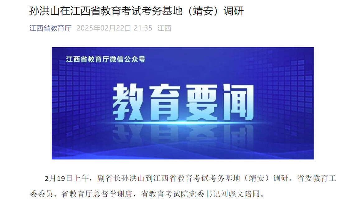 2月19日上午,副省长孙洪山到江西省教育考试考务基地(靖安)调研。省委教育工委委员、省教育厅总督学谢康,省教育考试院党委书记刘彪文陪同。