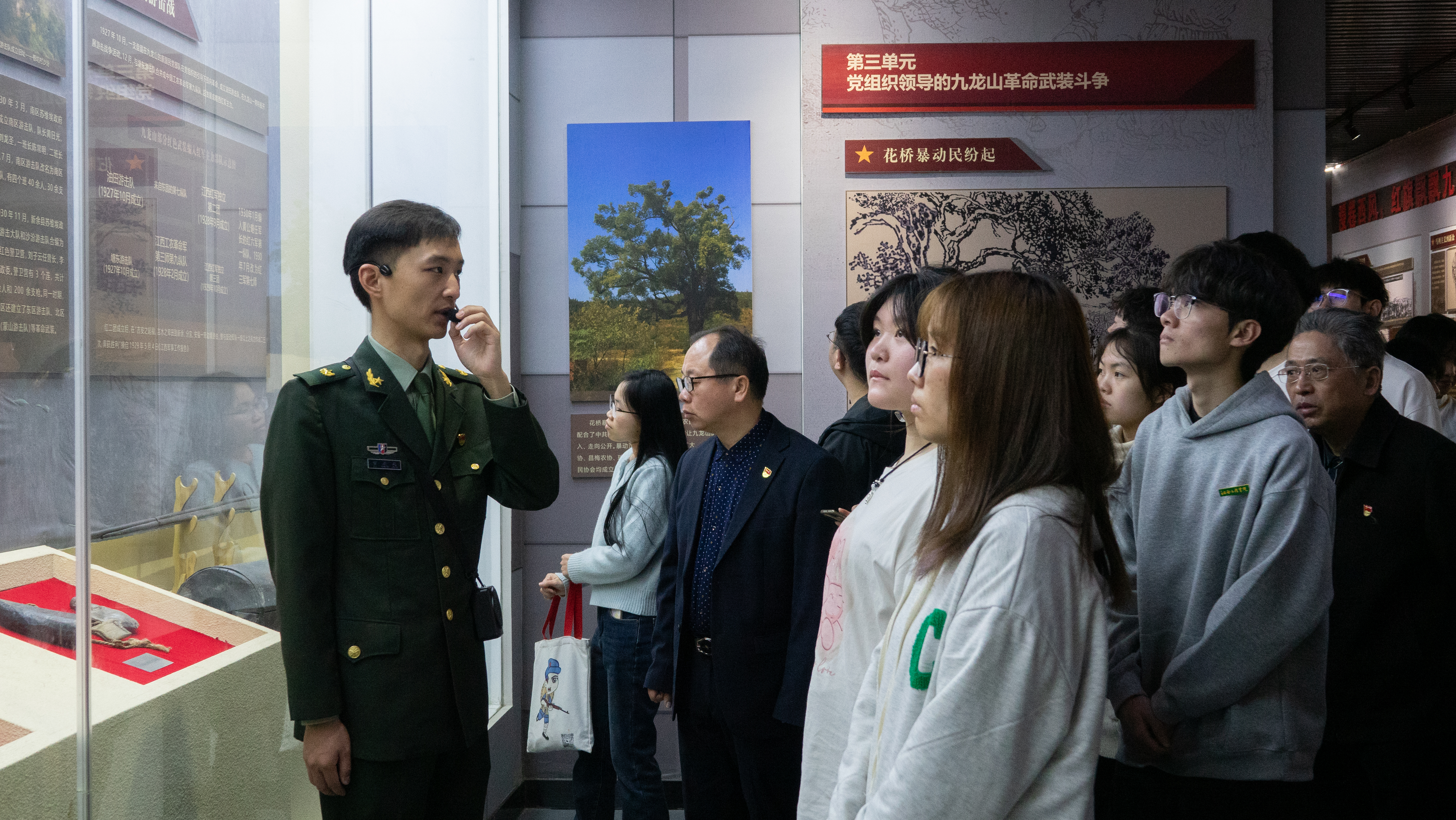 在九龙山革命斗争陈列馆,宣讲团创新采用 “一堂多师” 模式开展宣讲。九龙山乡讲解员胡成龙介绍,陈列馆占地1186.05平方米,包含展陈厅、多功能会议厅和沉浸式剧场。其中433.84平方米的展陈厅,以九龙山革命斗争为主线,融合图片、实物与多媒体,分革命斗争史、烈士缅怀、现代风貌及文创互动三部分,生动展现土地革命战争时期的艰苦斗争。