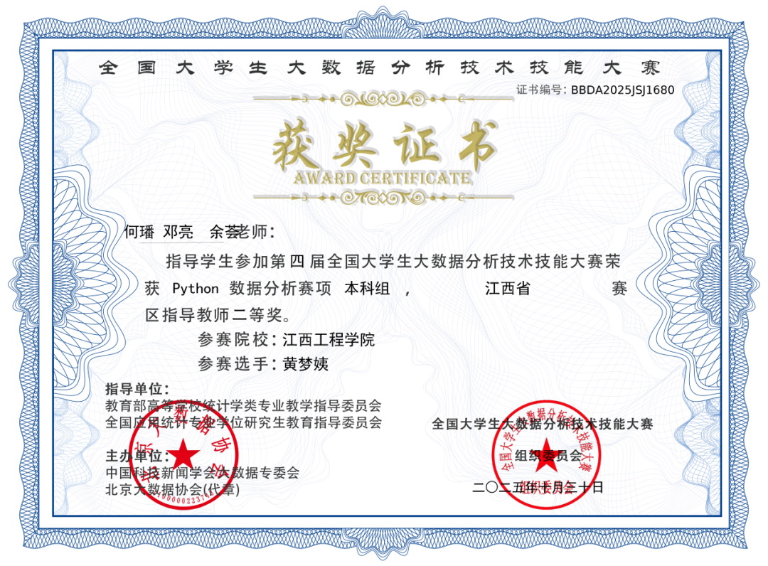 据悉,全国大学生大数据分析技术技能大赛是国内大数据分析领域的权威赛事,也是教育部认可的84项学科竞赛之一,大赛旨在检验和提升学生的大数据分析与应用能力。此次比赛中,在何璠、邓亮老师的悉心指导下,于隆杰、刘发、戴天祥、黄梦姨、赵诗瑾、程晓莉六位参赛学生积极备赛,在数据清洗、建模分析、可视化呈现等多个环节展现出过硬的专业素养,均获得省级二等奖。
