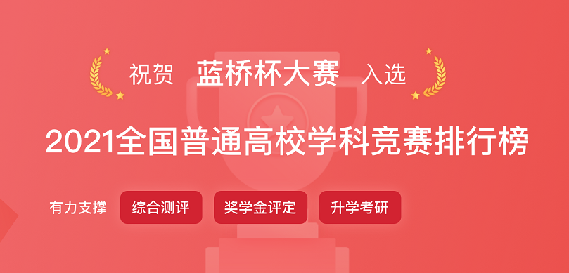 2022222日,中国高等教育学会发布2021年全国普通高校学科竞赛排行榜,蓝桥杯全国软件和信息技术专业人才大赛连续三年成功上榜,作为高校教育教学改革和创新人才培养的重要竞赛项目,持续有力支撑综合测评,奖学金评定,升学考研。