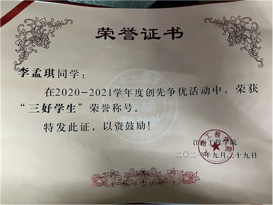 在校期间荣获2020年江西省“国家励志奖学金”、2020年参加“全国青少年井冈山革命传统基地”培训并获得结业证书、2021年江西省“国家励志奖学金”、2021年申请获得国家外观设计专利一项、2021年江西省“红色走读”云游作品三等奖、2022年第十三届中国高校美术作品学年展三等奖等证书。