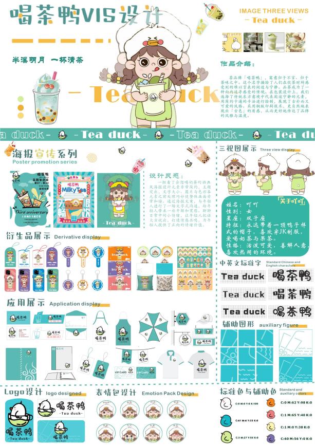 设计说明:《喝茶鸭》VIS手册设计是根据主题“古茶与现代奶茶融合”,进行发散思维联想到的奶茶品牌,与主题“喝茶”切合,根据品牌名称创作了ip形象,起名为吖吖,与产品切合,表现着古风古茶与现代、插画与奶茶的完美融合,更有生机,符合当代人的审美与茶饮习惯。