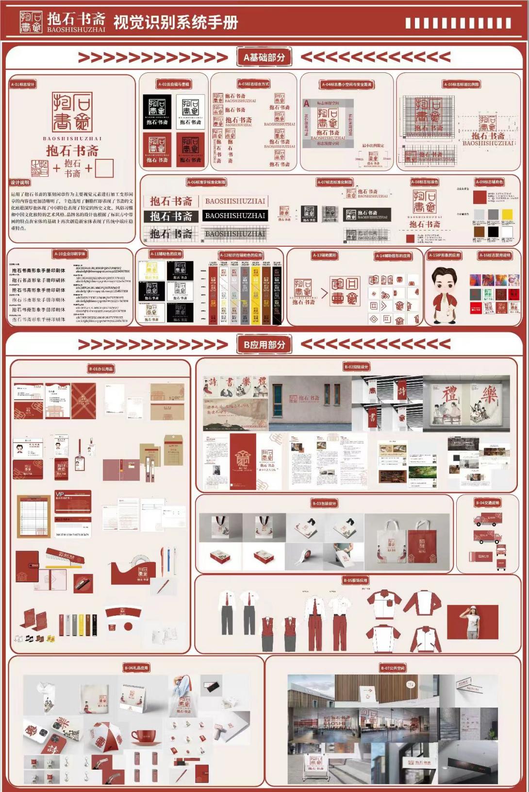 设计说明:设计采用了抱石书斋的篆刻闲章作为主要视觉元素,主色选用了胭脂红,即表现了书斋的文化底蕴深厚。品牌名的设计也根据了标识方中带圆的特点,在宋体的基础上再次创造新宋体,表现了传统中端庄稳重的特点。在Ⅵ设计分为基础部分和应用部分,这两个部分的运用不仅加深了外界对该企业的规范印象,也在办公环境的运用上得到了体现,提高了企业在员工和社会心中的地位,巩固了企业文化。