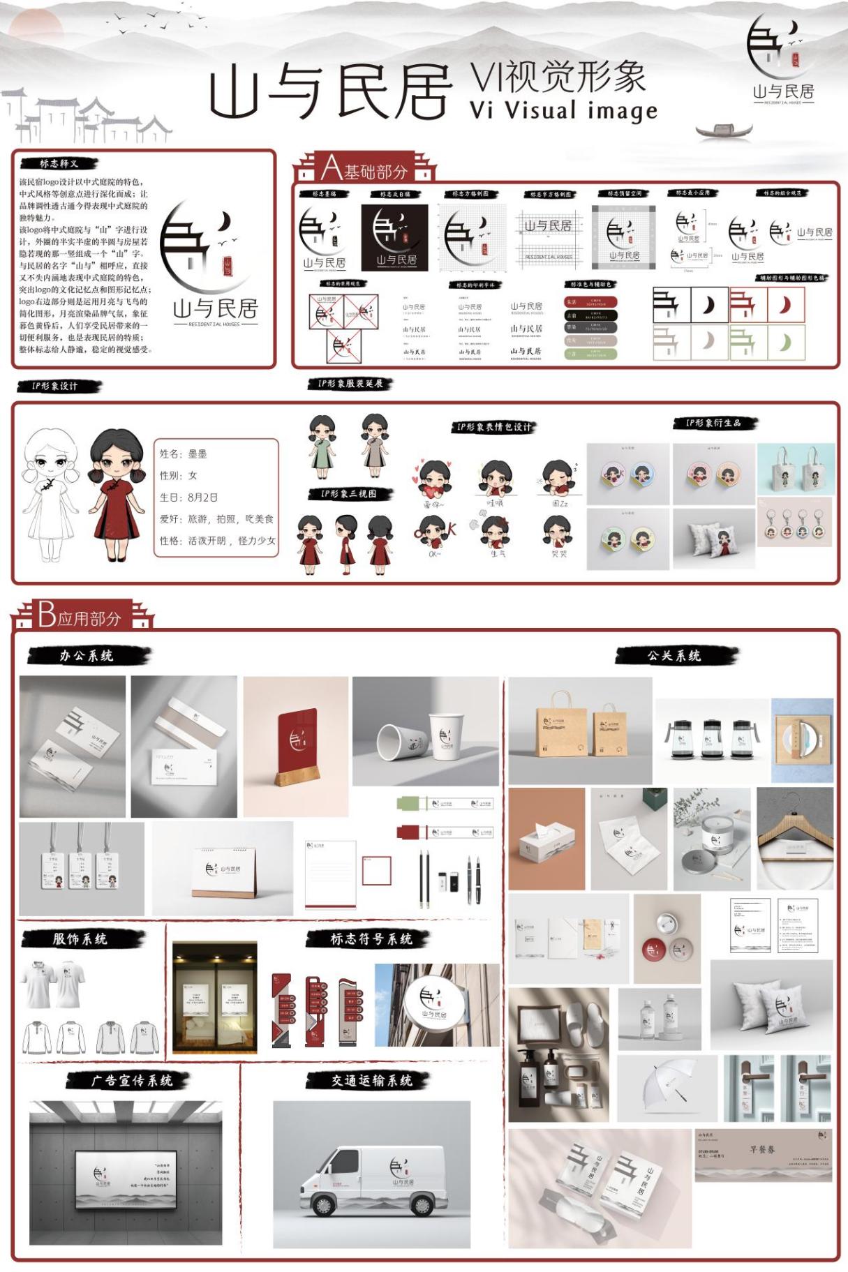 设计说明:山与民居vi视觉形象是根据徽派建筑创建的品牌,品牌标识以徽派建筑特有的飞檐斜角来展现,月亮与飞鸟渲染品牌氛围。品牌ip取名为墨墨,整体形象与性格定位与品牌调性相符。