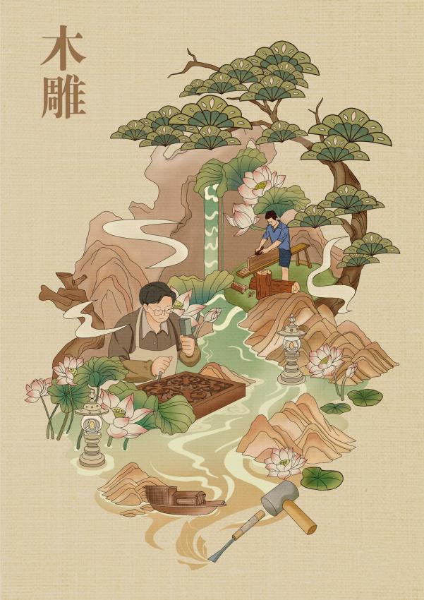 灵感来源于木雕。工匠认真地在木头上雕刻;以山川流水为情景,在荷花旁雕刻,意境而舒雅。