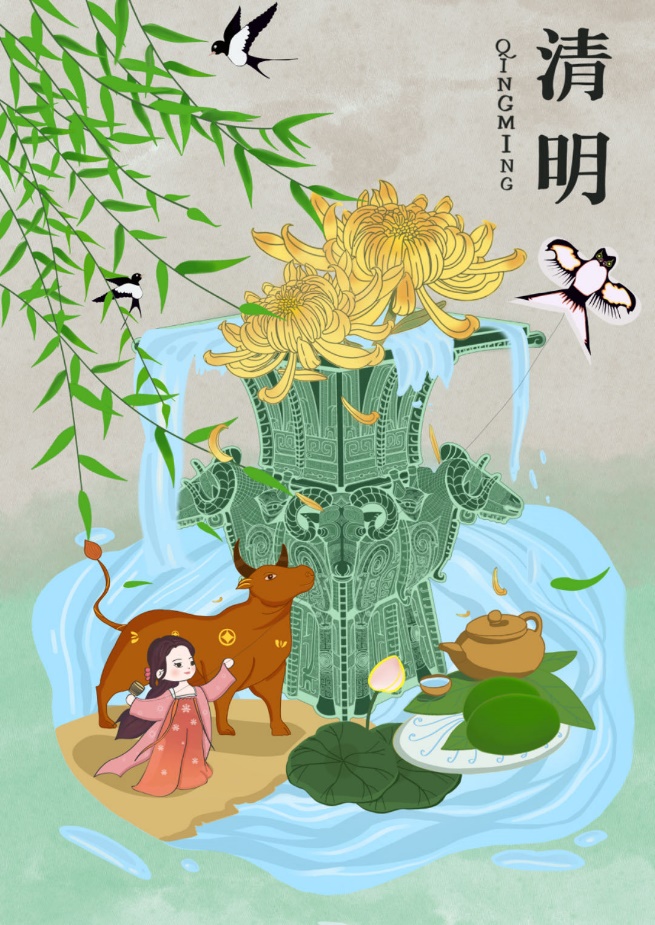 设计说明:该设计以二十四节气清明文化进行研究。节日的清明,是民间寄放情感和慰劳自己的传统日子。清明节气在时间和天气物候特点上为清明节俗的形成提供了重要条件。内容结合青铜器四羊方尊和清明元素进行创作,然后将插画应用到符合当下大众审美的作品中,最终其到推广二十四节气文化的作用。