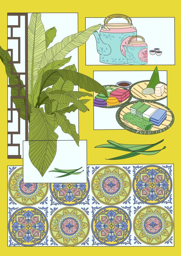 设计说明:以南洋娘惹风情文化为主题的分镜形式插画。将画面主要分为五个板块,分别是芭蕉以及具有娘惹特色的瓷砖,南洋娘惹糕点,斑斓叶等具有可读性和视觉冲击力的审美辅助性元素,恰到好处的分部在各个板块。更好的丰富和对应了主题南洋情。