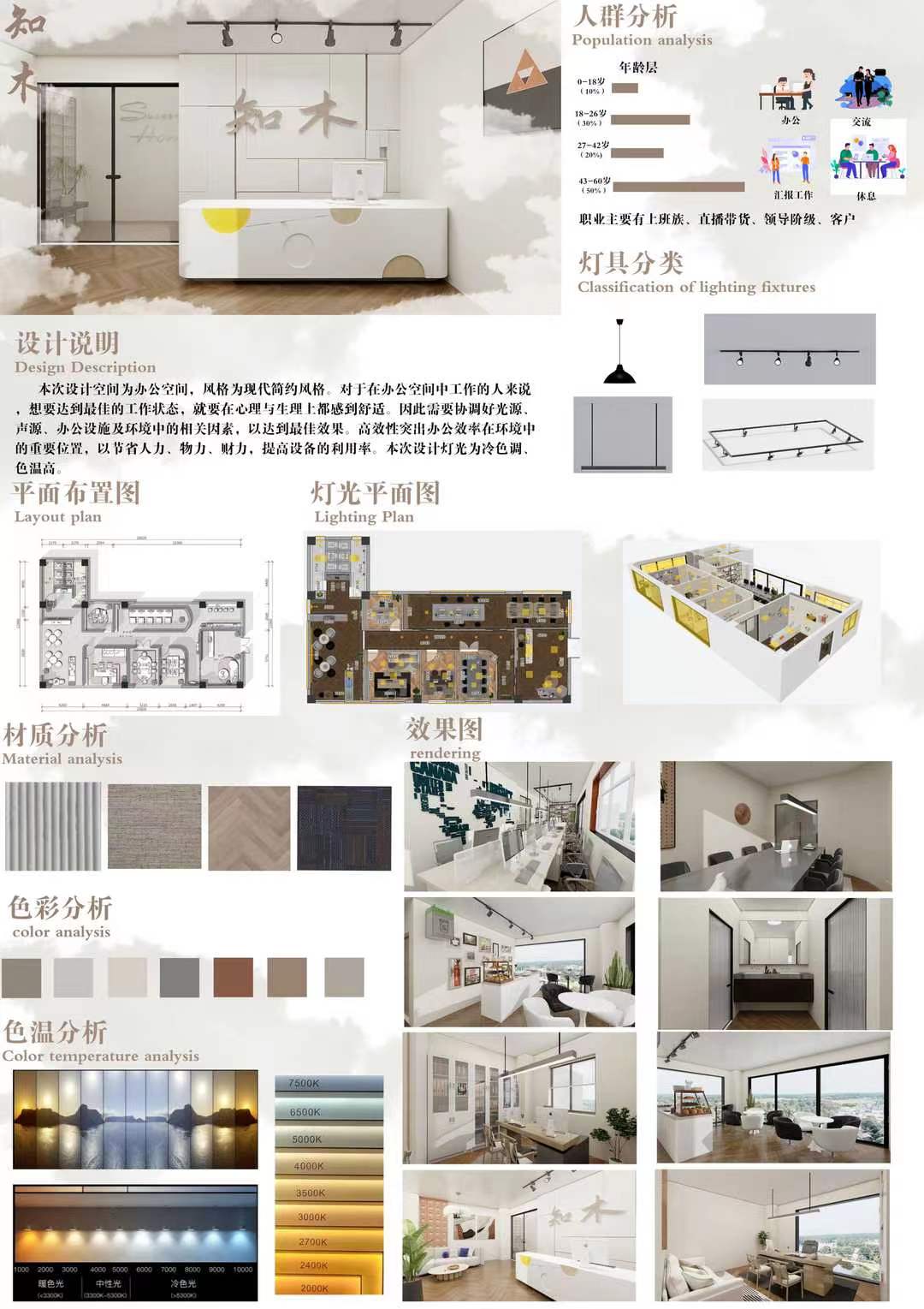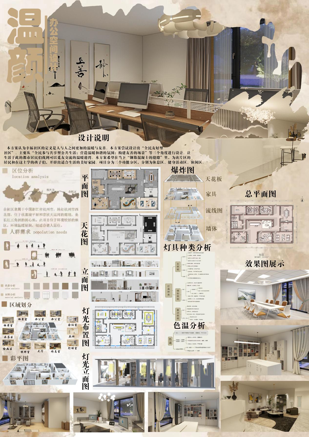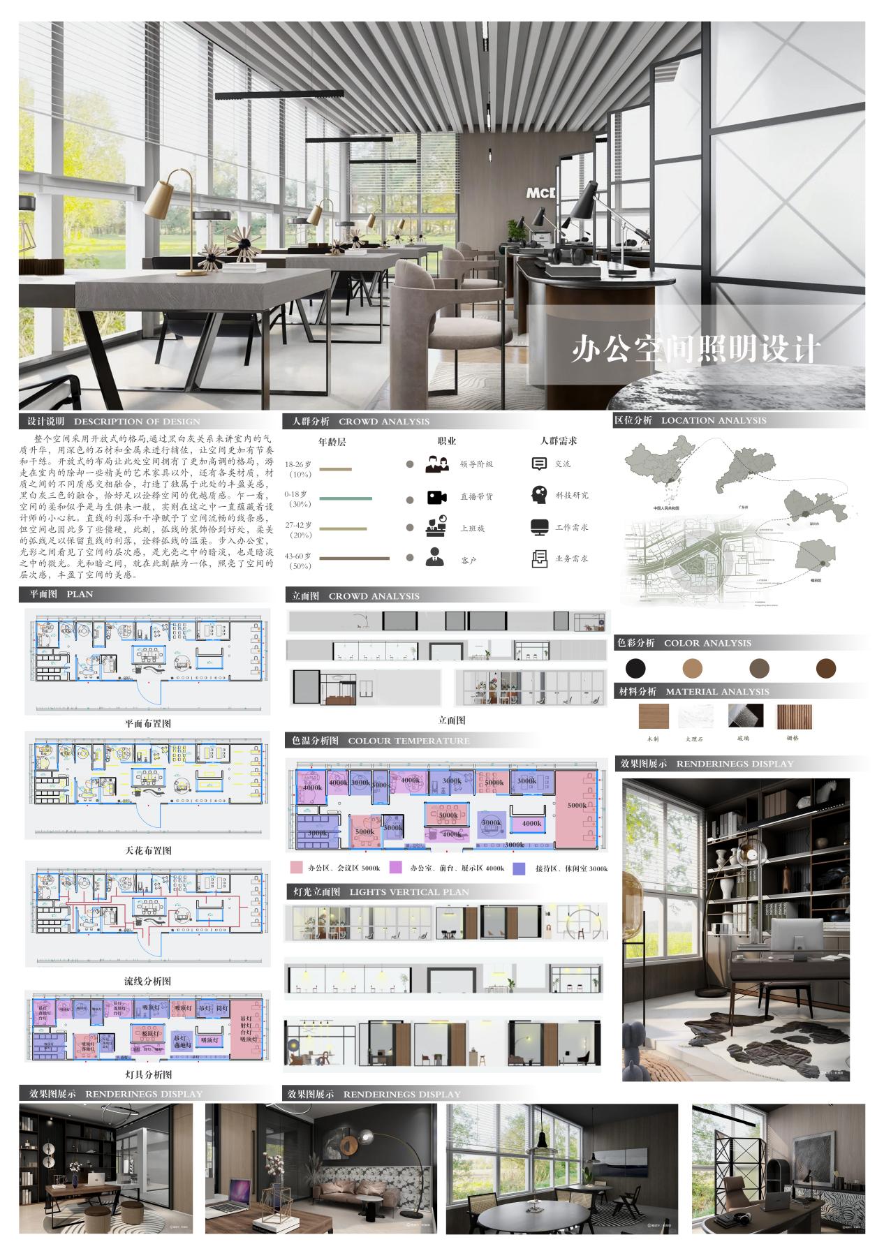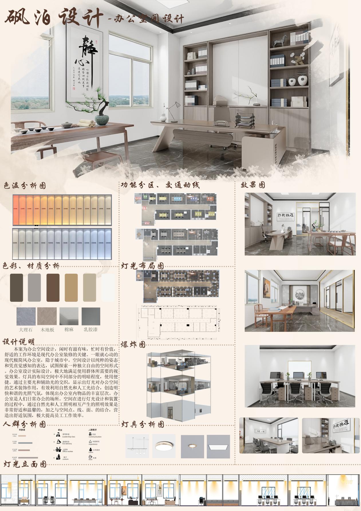 设计方案需考虑:(1)结合相关调研,提出设计的必要性,主题概念明确,设计思路清晰;(2)考虑空间灯光的重要性和灯具的实用性;(3)具有设计创意,功能尺度和设计合理;(4)能够体现绿色设计理念和服务性理念。