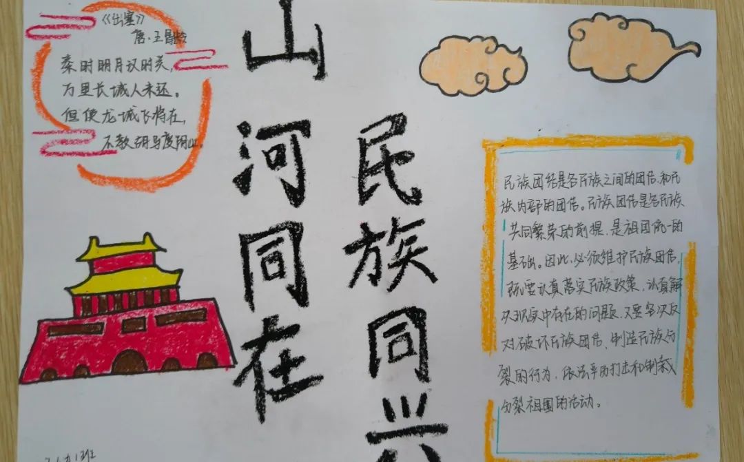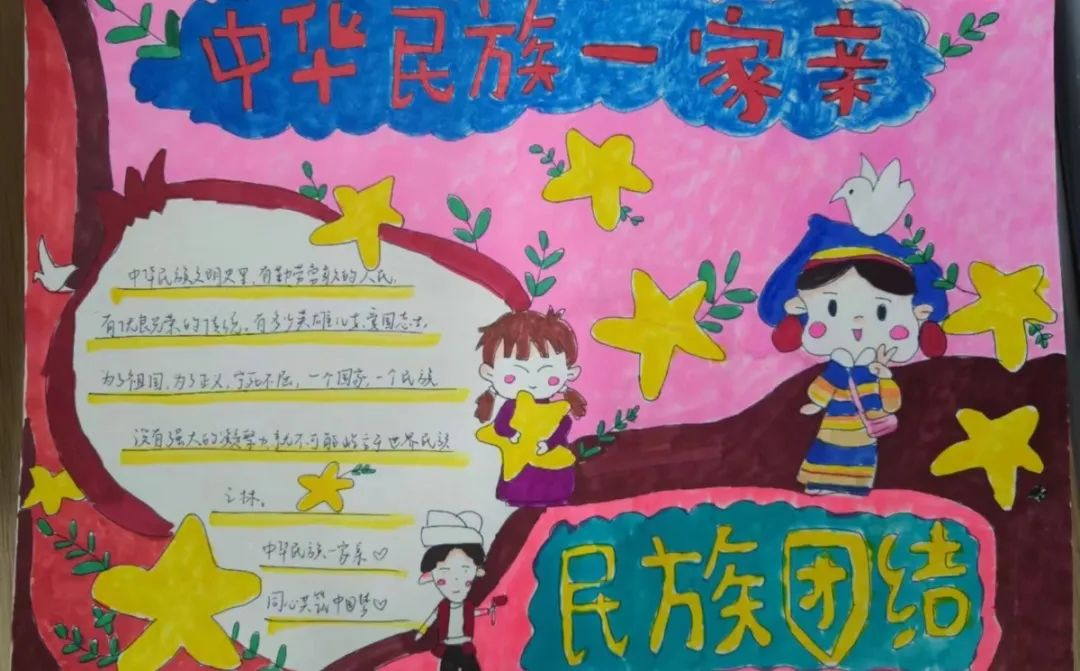 我们的手抄报,记录了民族大团结的美好瞬间,展现了各民族共同奋斗的精神风貌,更表达了我们对祖国的热爱和对未来的憧憬。让我们以这次活动为契机,更加紧密地团结在一起,铸牢中华民族共同体意识,为实现中华民族伟大复兴的中国梦而努力奋斗!
