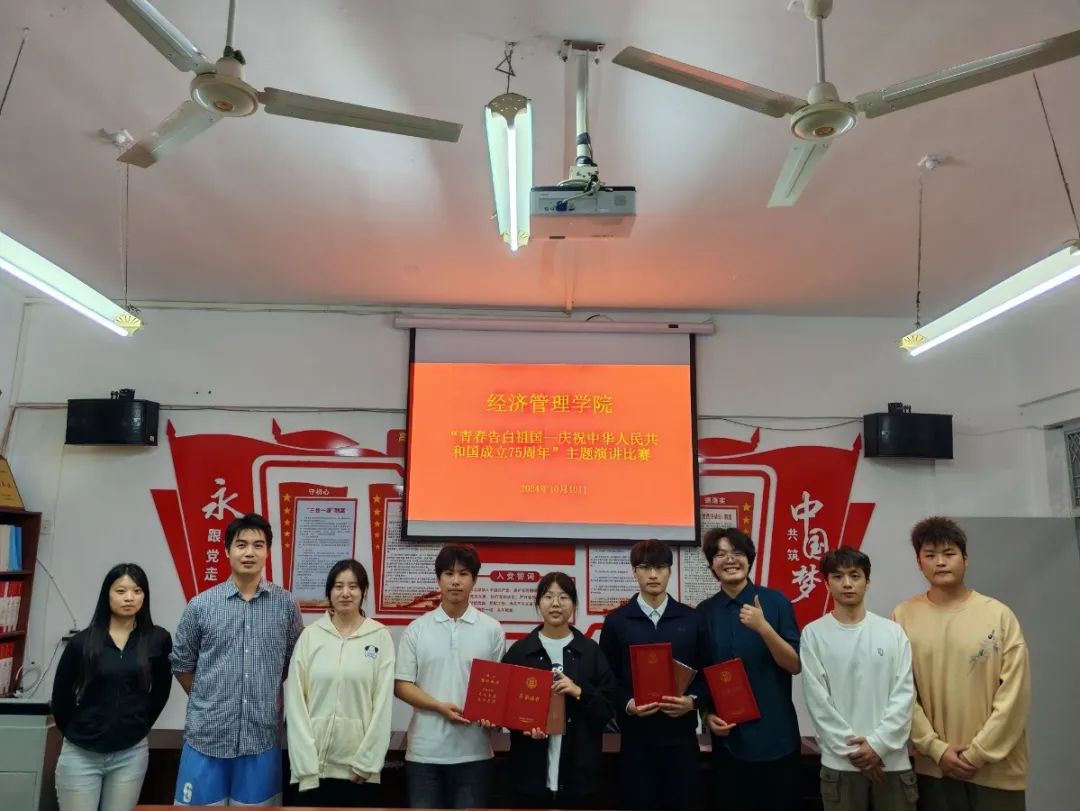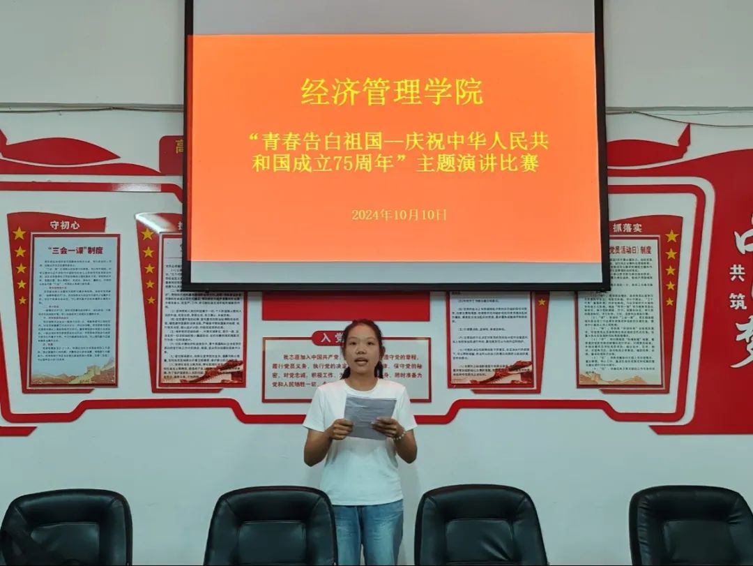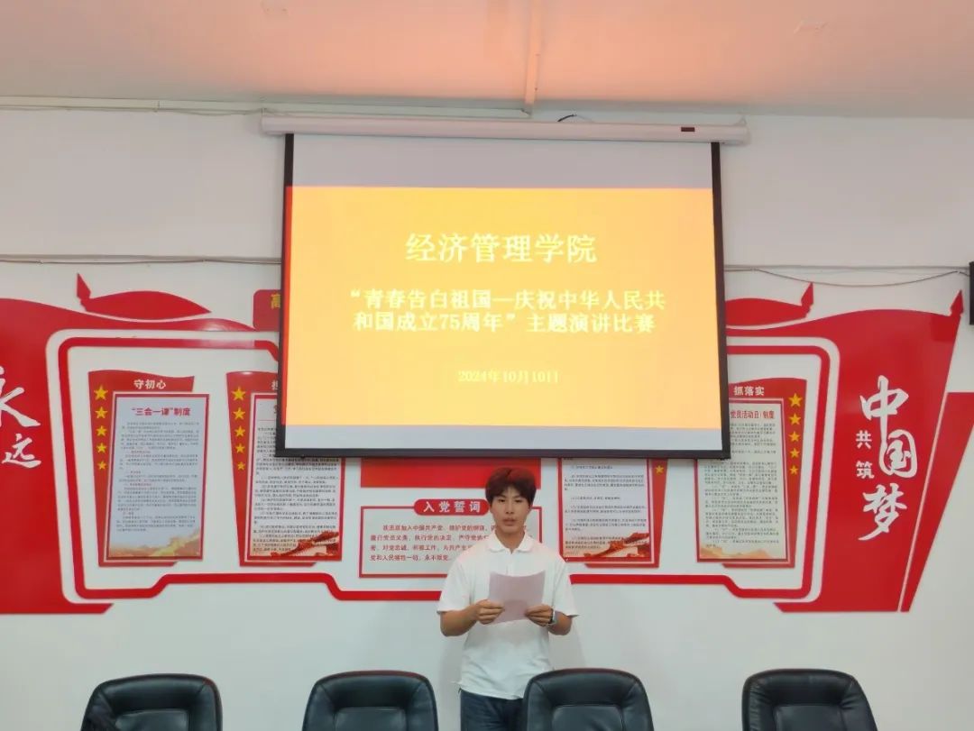 为庆祝新中国成立75周年,激发青年大学生的爱国热忱,促进新青年在新时代伟大征程上奋勇前进。10月10日18:30,经济管理学院在B201会议室举行“青春告白祖国——庆祝中华人民共和国成立75周年”演讲比赛。本次比赛由团总支学生会学术部成员杨小慧主持,专职辅导员谢纹老师和李桃老师,团总支学生会副书记王季欣,团总支学生会副主席熊文杰担任评委,我院22级和24级各班学生代表参加。