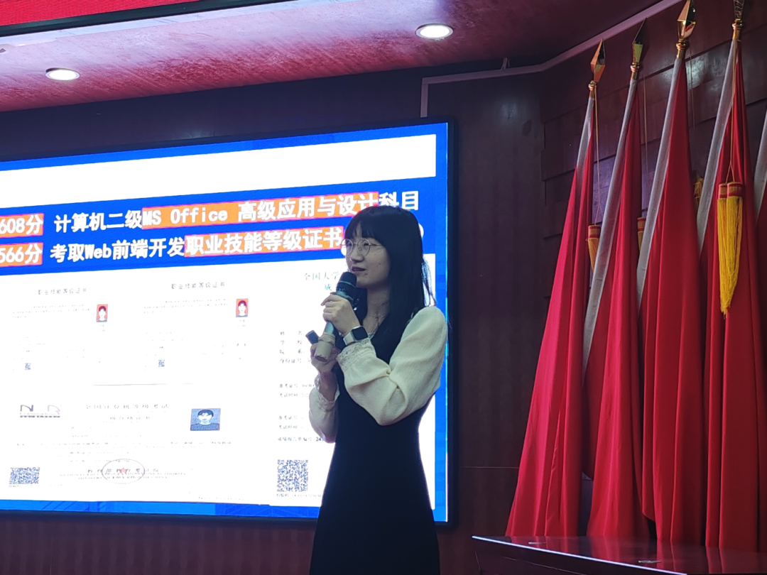 分享会上,学姐讲述了自己在大学期间努力学习并考取了多项优秀证书的经历。她强调,优秀的证书不仅是对自身勤勉好学品质的彰显,也是未来的求职生涯敲门砖,她建议2024级的新生们应科学规划自己的未来,勇敢地去探索和实践各项活动和竞赛,保持高绩点,提升综合素质能力,为自己的未来增添砝码。