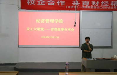 岁月如歌,筑梦芳华。为引导和帮助广大青年学生在大学期间明确学习目标、增强学习信心,激励新时代青年学生们积极进取,奋发向上。10月16日晚七点,经济管理学院在C105举办了天工大讲堂——青春故事分享会活动。本次活动由经济管理学院团总支学生会学术部洪烨主持,经济管理学院2021级金融工程本科1班孙浩主讲。