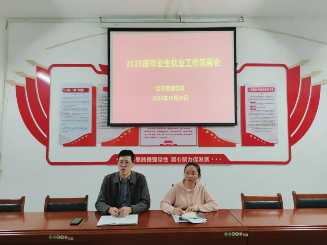 为深入学习贯彻党的二十届三中全会精神及全国教育大会精神,全面执行党中央、国务院和省委、省政府关于高校毕业生就业工作的决策和部署,2024年10月28日,经济管理学院召开了2025届毕业生就业工作部署会。本次会议由经济管理学院院长谭文武主持,党总支书记张文凤和全体辅导员(班主任)参加。