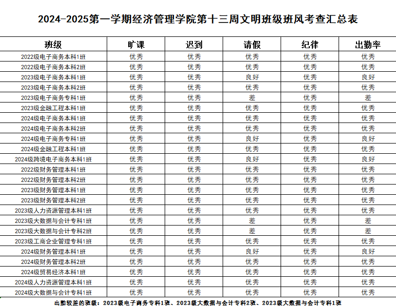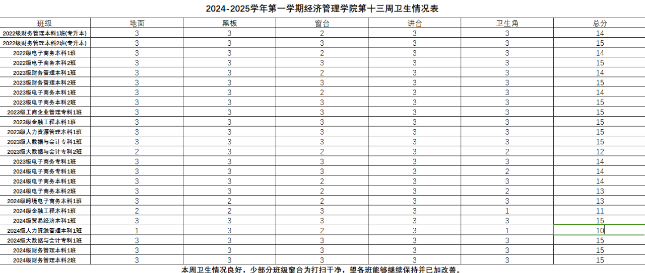 希望表现优秀的班级能够再接再厉,继续保持良好的状态。同时,部分班级也需要加以改进,以提升整体的班级班风水平。我们期待所有班级都能够积极行动起来,为营造一个更加文明、整洁、有序的学习环境而努力。