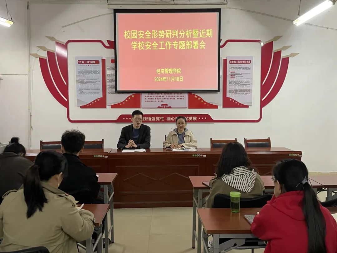 为深入推进平安校园建设,研判分析近期校园安全形势,并部署有针对性的风险化解工作,确保校园安全稳定,为学生在校安全提供保障。2024年11月18日,经济管理学院在A栋401会议室召开校园安全形势研判分析暨近期学院安全工作专题部署会。会议由院长谭文武主持,党总支书记张文凤及全体辅导员(班主任)参加会议。