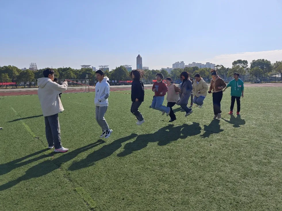 三人四足讲究默契,步伐节奏得同频共振,如同绑在一起的“战友”,心齐才能稳步向前。一边是三条腿协调迈进,另一边是跳绳在空中飞舞,考验团队协作,更挑战体能极限。