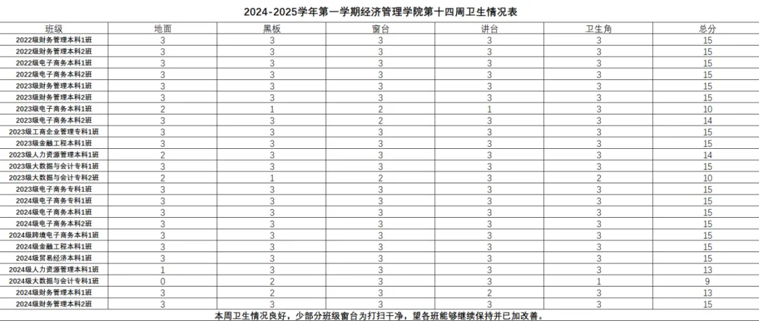 希望表现优秀的班级能够再接再厉,继续保持良好的状态。同时,部分班级也需要加以改进,以提升整体的班级班风水平。我们期待所有班级都能够积极行动起来,为营造一个更加文明、整洁、有序的学习环境而努力。