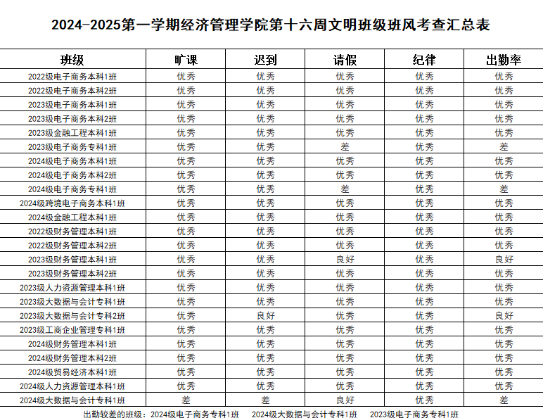 希望表现优秀的班级能够再接再厉,继续保持良好的状态。同时,部分班级也需要加以改进,以提升整体的班级班风水平。我们期待所有班级都能够积极行动起来,为营造一个更加文明、整洁、有序的学习环境而努力。