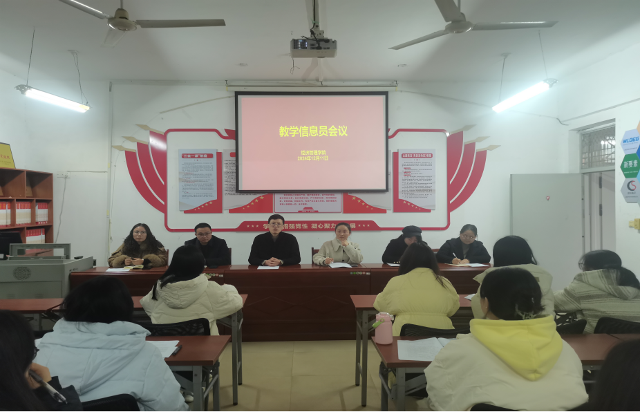 20241211日下午,经济管理学院在教学楼A401会议室召开了期末教学信息员会议。本次会议由经济管理学院教学督导胡艳芳主持,学院院长谭文武,党总支书记张文凤,副院长朱伙军、邹莉,办公室主任李欢,教学督导蔡卉、孙莹以及本院全体教学信息员参加了此次会议。