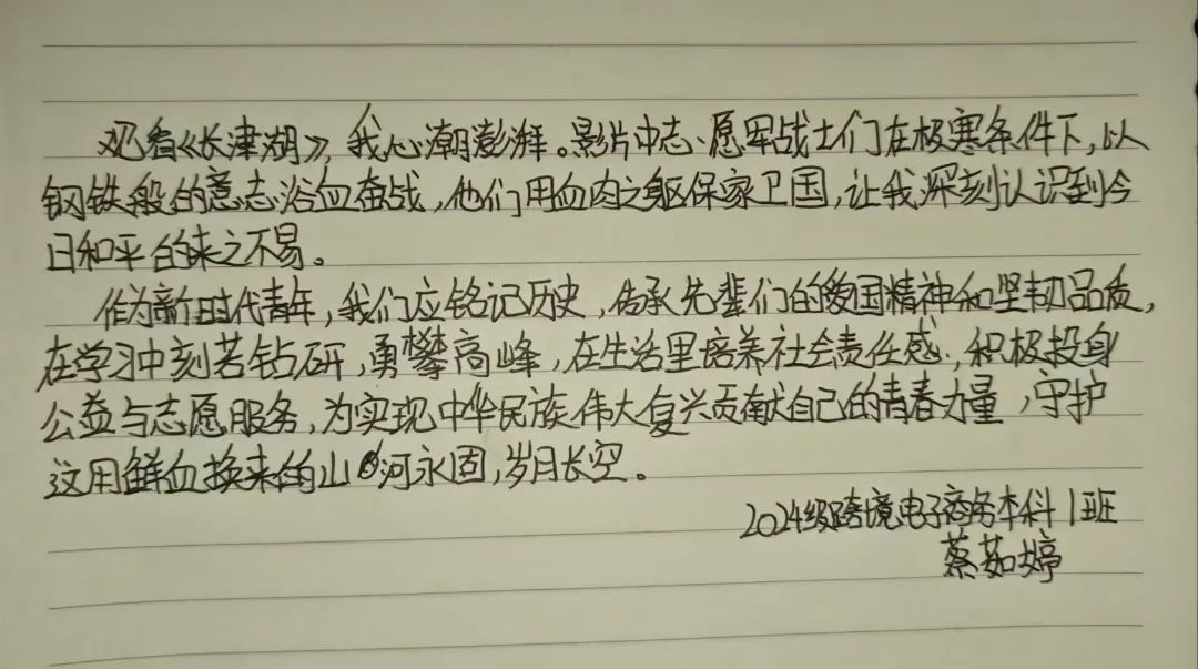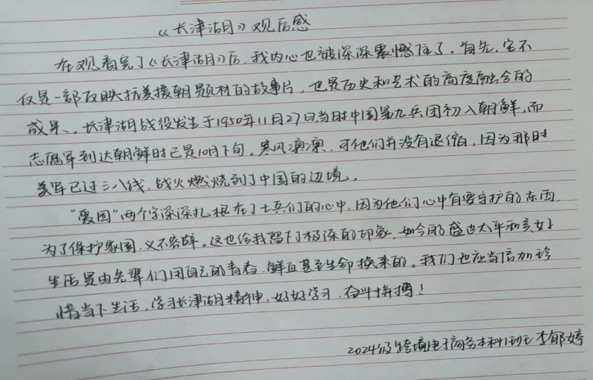 为了进一步加强爱国主义教育,弘扬红色精神,厚植爱国情怀,引导当代青年发扬不惧困难、刻苦努力、顽强拼搏的精神。12月24日,经济管理学院组织红色班级星火耀华班集体观看红色电影《长津湖》,2024级跨境电子商务本科1班的全体学生共同观看。此次观影不仅是一次视觉与心灵的震撼之旅,更是一次深刻的历史教育与精神洗礼。