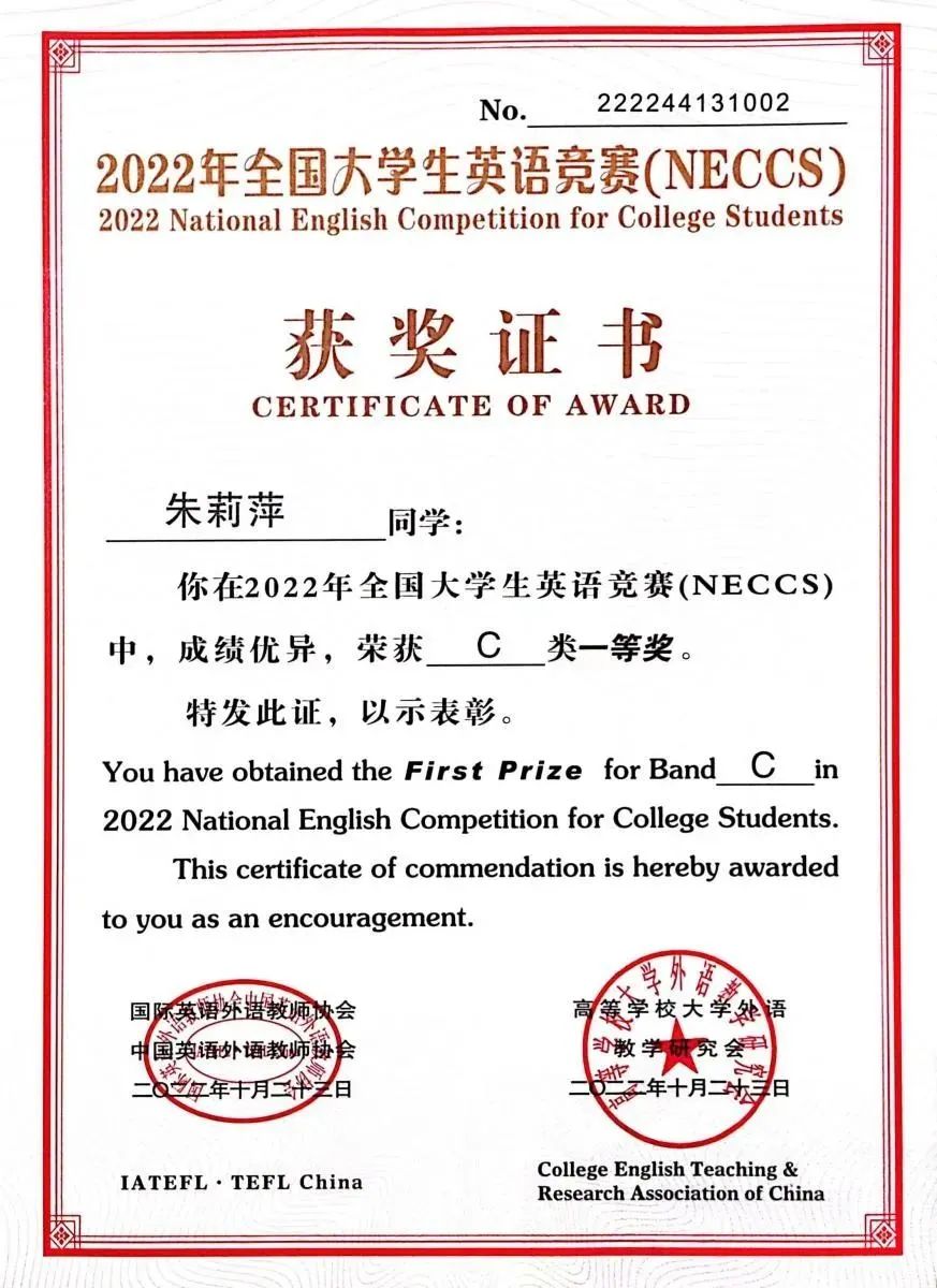 2.2022年10月获得“全国大学生英语竞赛”一等奖