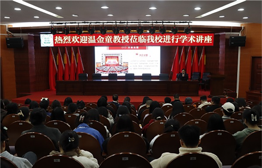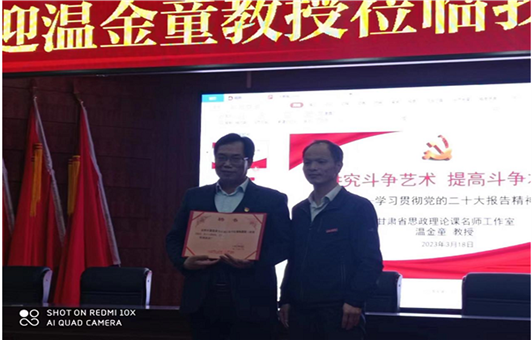 为深入学习宣传贯彻党的二十大精神,3月18日下午,中国人民大学博士、甘肃农业大学硕士生导师温金童教授受邀来我校文科楼一楼学术报告厅作以《讲究斗争艺术提高斗争本领——学习贯彻党的二十大报告精神》为题的专题讲座,马克思主义学院的全体教师、抱石艺术学院部分师生代表参加会议,讲座由我校马克思主义学院副院长胡延庆主持。