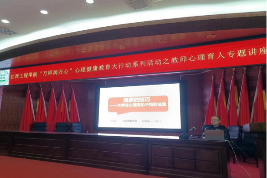 为切实增强广大教职工参与学生心理健康工作的能力水平,推动教师们人人成为“心理教练”,我校举办“万师润万心”系列活动之心理育人专题讲座。3月1日下午,公共课教学部直属党支部书记、主任聂水晶应邀在天工校区学术报告厅为教师们开展“揣摩的技巧——大学生心理危机干预的法宝”心理育人专题讲座,校心理健康教育与咨询中心主任晏双平主持,学校全体辅导员(班主任)、抱石艺术学院、电子信息工程学院和公共课教学部全体教师等200余人聆听了讲座。