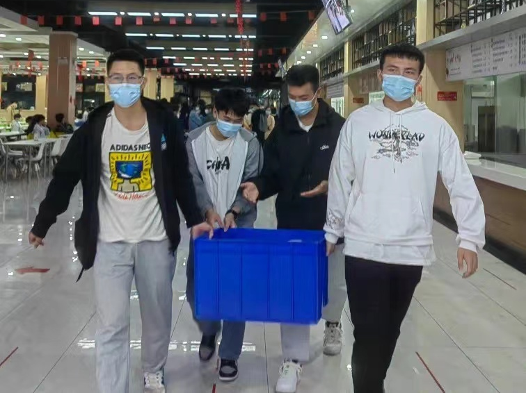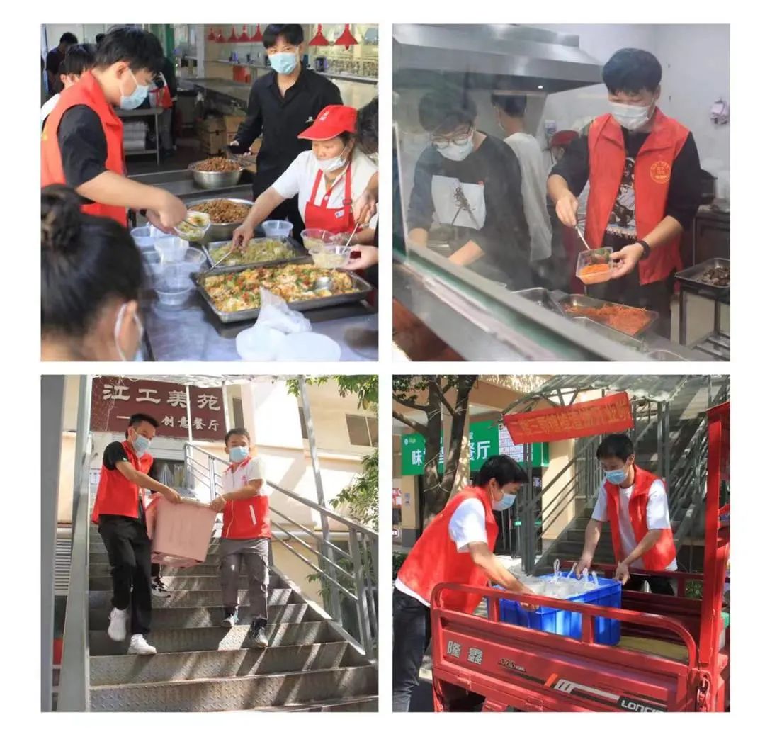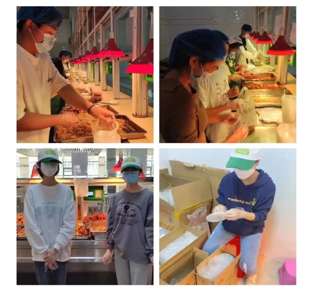 为了能够让同学们按时吃上热腾腾的一日三餐,青年志愿者们从早晨6点多就开始协助后勤处到食堂准备餐食,大家整齐有序地将饭菜盛入饭盒、逐个打包、协助送餐、发放……同时,在各个餐厅用餐时间,志愿者们温馨提醒着大家佩戴口罩、保持一米间距……