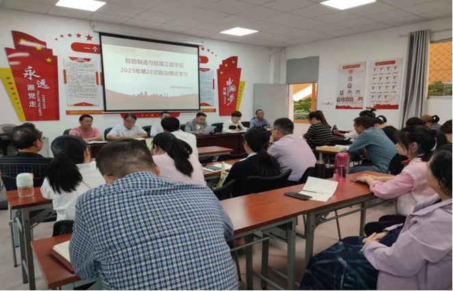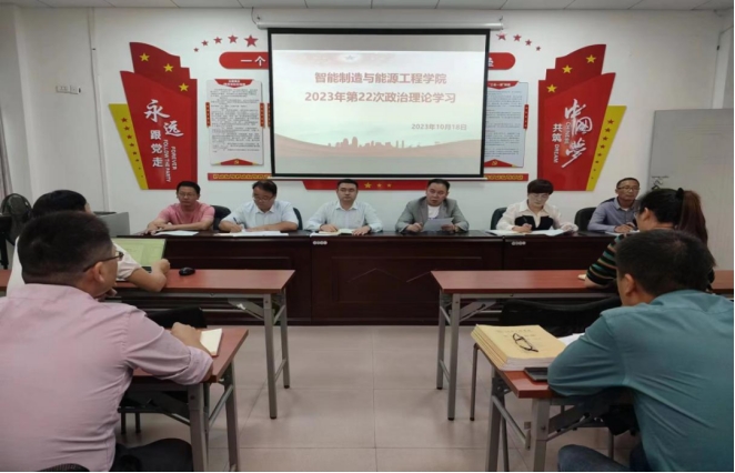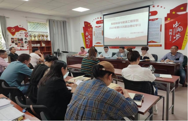 10月18日下午,智能制造与能源工程学院在仙女湖校区B栋104会议室召开第22次政治理论学习会,会议由学院党总支书记范向红主持,院长史洪松、副院长彭秋梅、党总支副书记李思以及全体教师参加了此次会议。